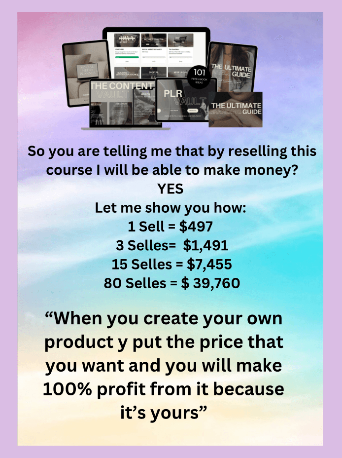 With 100% Resell Rights the product is owned by you. You can take download the course and host it on your own site, or direct your customers to the your site. The product sale is connected to your online payment gateways. So the sale goes directly into your account. No middle man. No company that owes you commission. YOU OWN THE SALE.