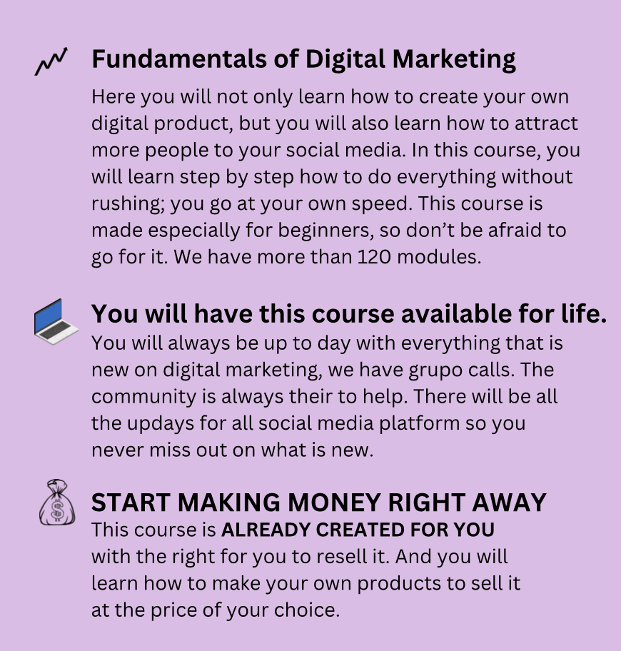 This is a comprehensive marketing course designed for beginners (even with no experience) to learn how to launch a successful digital marketing business. This is a DONE-FOR-YOU in-depth marketing course. The course includes step-by-step modules that will walk you through launching your digital product business and how to use digital marketing to make sales. You will learn how to brand yourself, perform well on SEO, market on various social media channels, how to create highly converting sales funnels, email campaigns and everything else you need to create a profitable passive income business. This product is unique because once you buy it you own it. This means you can re-brand and sell it for 100% profit.