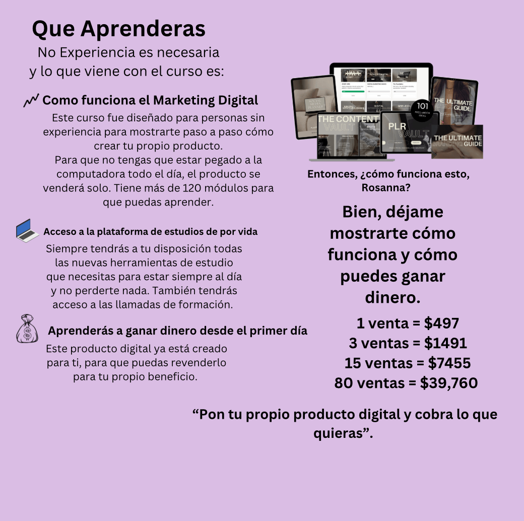 This is a comprehensive marketing course designed for beginners (even with no experience) to learn how to launch a successful digital marketing business. This is a DONE-FOR-YOU in-depth marketing course. The course includes step-by-step modules that will walk you through launching your digital product business and how to use digital marketing to make sales. You will learn how to brand yourself, perform well on SEO, market on various social media channels, how to create highly converting sales funnels, email campaigns and everything else you need to create a profitable passive income business. This product is unique because once you buy it you own it. This means you can re-brand and sell it for 100% profit.